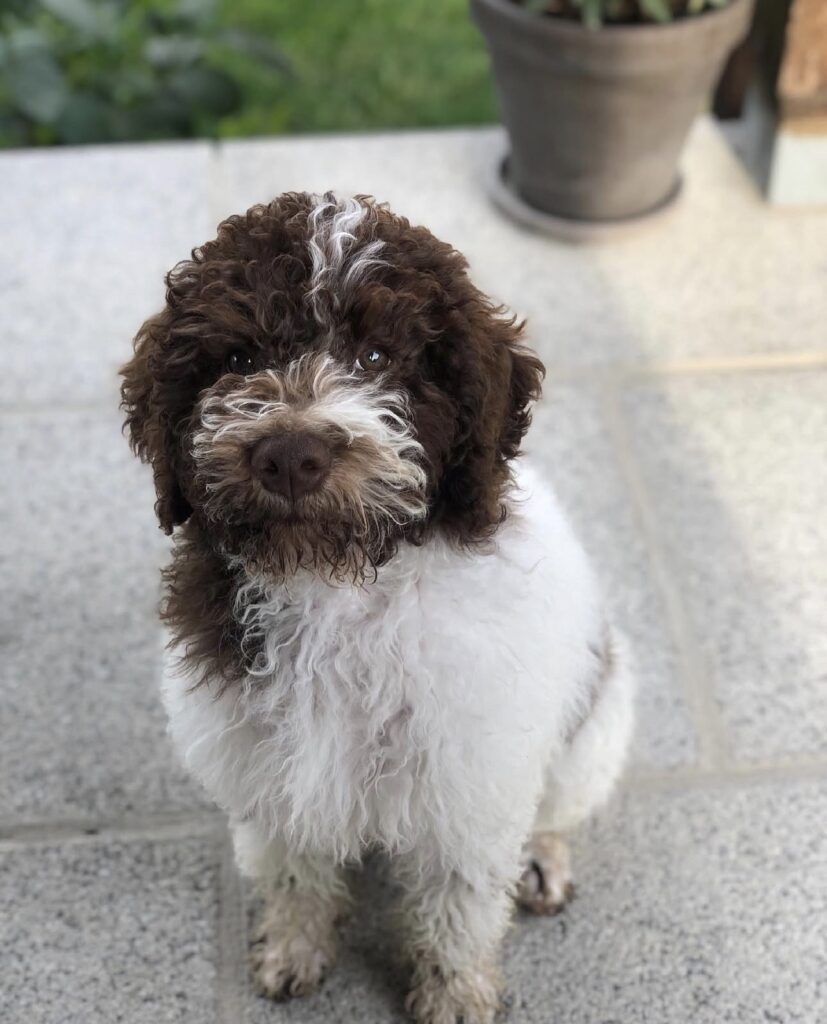 Bodhi’s brown-and-white curly coat reflects the classic Lagotto Romagnolo look, dense and soft with well-defined curls. His structure is balanced, and his development has been steady and healthy, supported by attentive care and proper nutrition from the start.