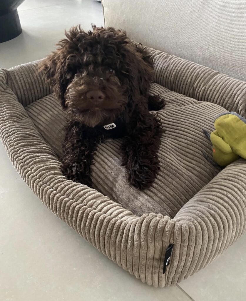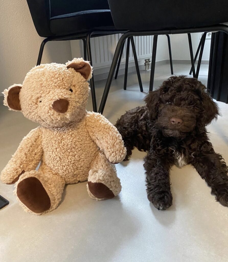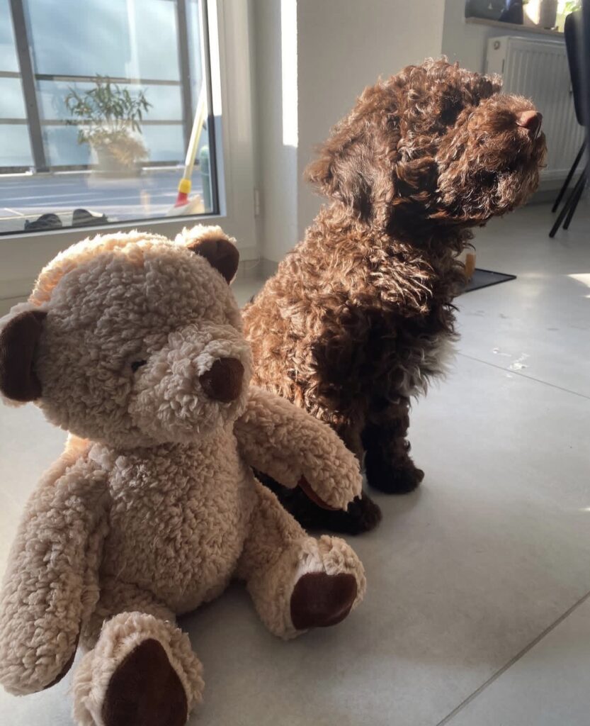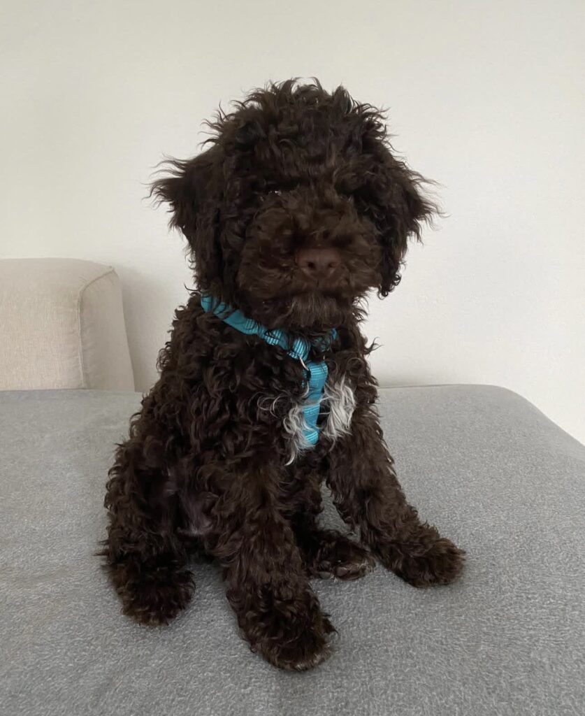 Bruno’s coat is dense and curly, typical of the Lagotto Romagnolo, and low-shedding. He has already begun gentle grooming exposure, making handling and brushing a familiar part of his routine.